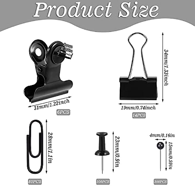 【Size Details】The size of the black binder clips is 1.33*0.74 inches, the size of the pushpin clip is 1.22inch, the length of the nail is 0.35 inches, the size of the black pushpin is 0.9inch, the size of the black paper clip is 1.1 inches, map pin size is 0.59 inches, ball diameter is 0.16 inches