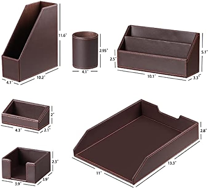 【6 Piece Office Supplies Desk Accessories Set】1*Paper/ Document Tray, 1*Magazine Holder, 1*Mail Sorter, 1*Pen Cup, 1*Sticky Note Holder , 1* Business Card Holder. Whether you seek desk accessories for men office or desk decorations for men office, This 6 piece set of desk accessories & workspace organizers has everything you need. fits your office theme perfectly.