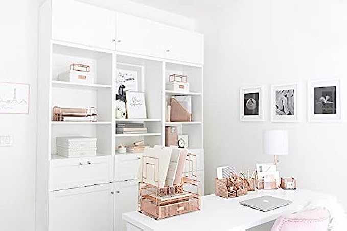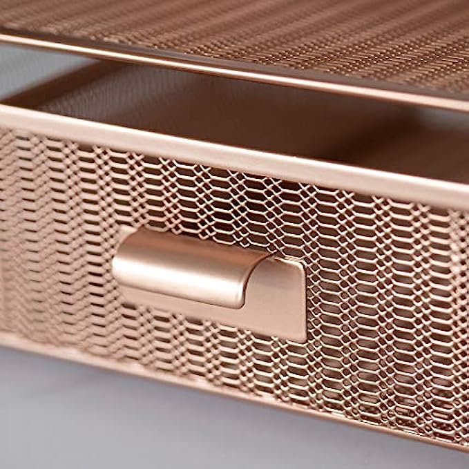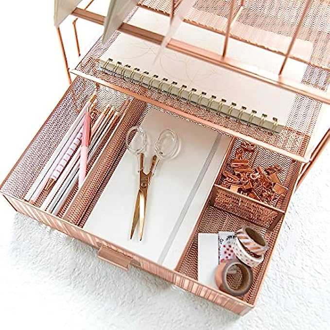 MODERN, SPACE SAVING DESIGN: Organization does not have to be difficult. Made of metal finished in rose gold and featuring a unique mesh design, this Vertical and Horizontal File and supplies organizer with drawer and letter sorter keeps things organized and saves space.