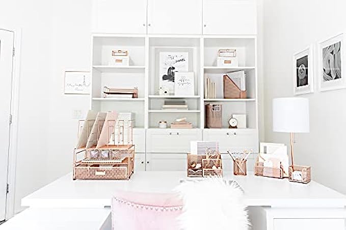 PREMIUM QUALITY: Made of strong metal mesh and finished with rose gold paint, this File Organizer looks great on any desk! This all in one inbox organizer caddy will look great on a desk while also offering functionality and a modern look.