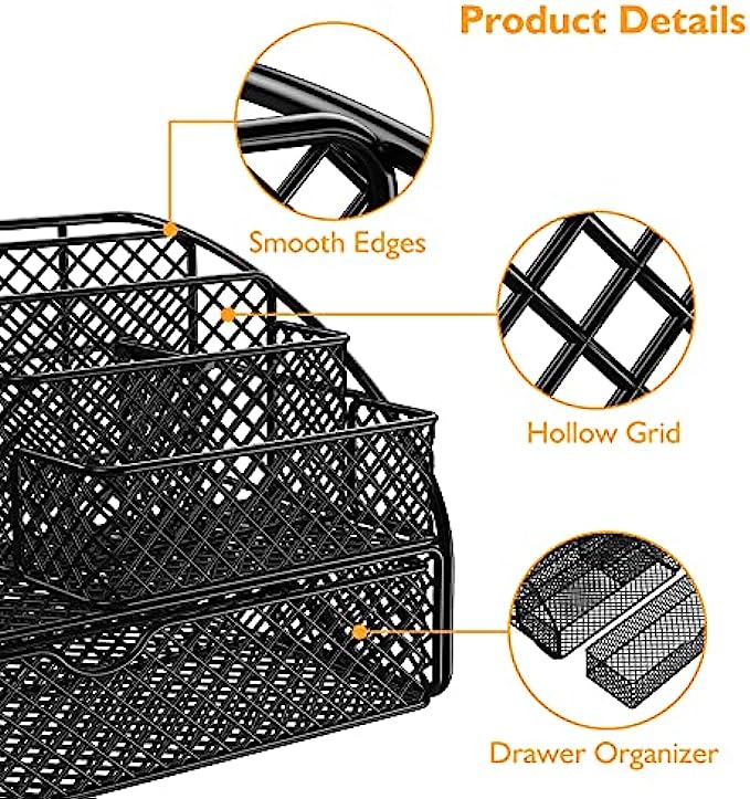 • 【Sturdy & Stylish】: Mesh desk organizer is made of quality mesh metal, durable sturdy, stylish, compact appearance. No impossible to bend or scratch with normal daily use. This desk caddy won’t wobble, when you pull out the drawer. Suitable for busy professionals, bloggers, students, teachers, and more.