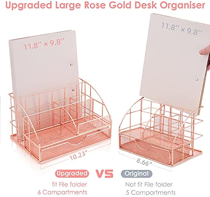 • UPGRADE LARGER SIZE MORE SPACE: ARCOBIS rose gold desk organizer is larger than other similar designs on the market and has more storage space. The largest back compartment can easily hold up to 280 A4 sheets; 6 Compartments + 1 Large Drawer for important documents, pens, paper clips, pencils, scissors, and all office accessories.