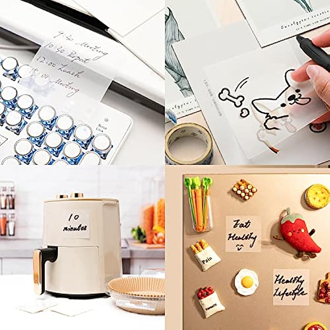 • Transparent Design: Upgraded see through sticky notes, lies flat and almost invisible, jut stick it on books or documents, annotate, highlight or trace directly, the underneath text will not be covered, protect your books instead of leaving permanent marks on them when taking notes.