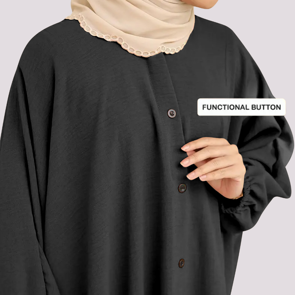 Comfort:selesa Material: cey not thick not rare Completely used for those who like to wear loose baggy clothes, they are big but the drop type fabric doesn't look big, the buttons are just decorations but there is a zip on the back of the 3/4 sleeve, satisfied