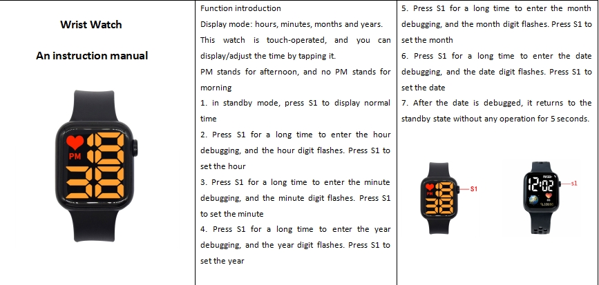 True to the description: good Material: plastic material plastic Color: green color green Cheap, nice watch. Quite easy to use, I followed your instructions here to do it. Can be seen, on, date. There are also hours counting. My hands are small 13cm but still fit. The thing is, I see that the machine is light waterproof to wash hands, but looking at the side of the machine with holes like this, I am not sure if it is waterproof or not. With the price range of 20k, I am satisfied. Hope to use it for a long time.