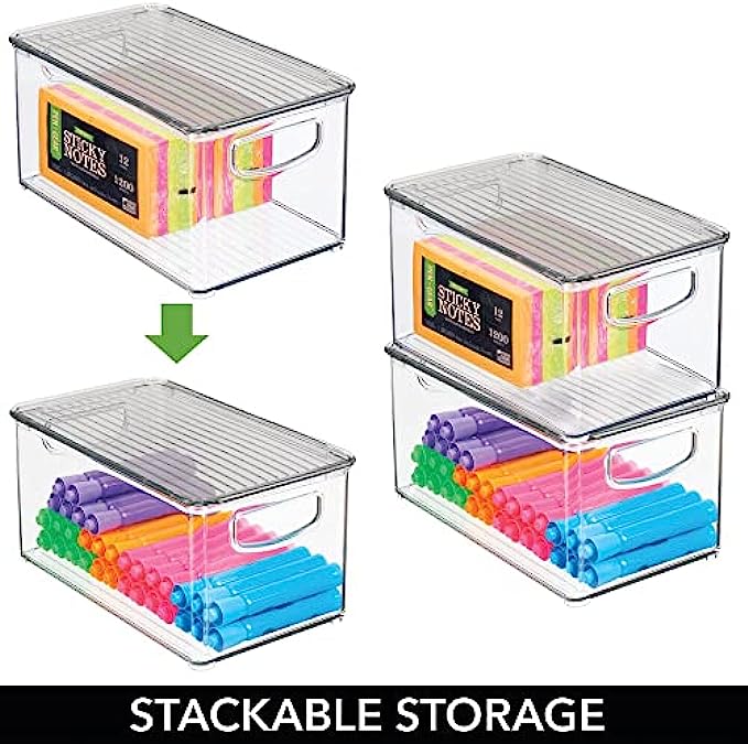 mDesign Plastic Storage Bin Box Container with Lid - Built-in Handles - Organization for Pens, Pencils, or Work Supplies in Home Office, Cabinet, or Desktop, 4 Pack, Clear/Smoke Gray