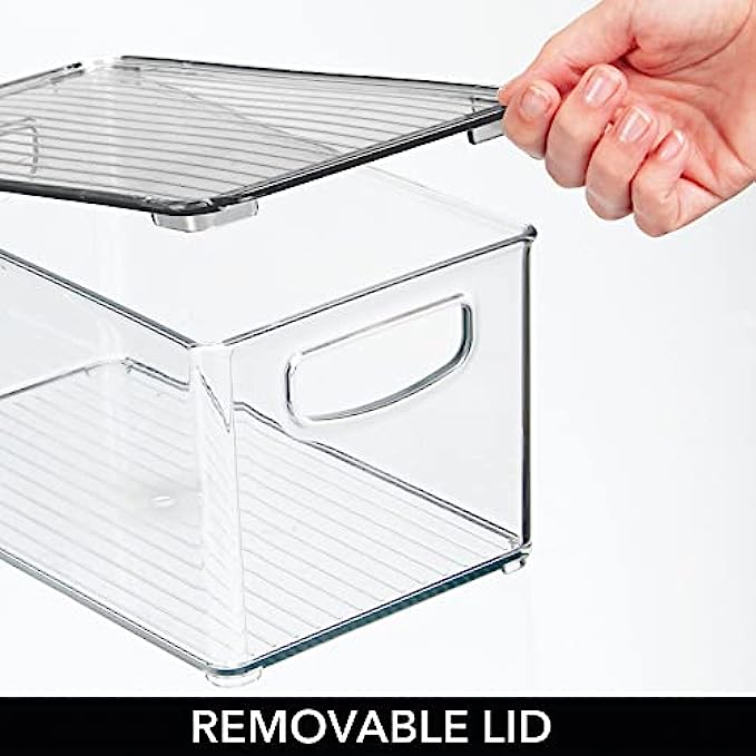 HANDLES: Bins feature easy-carry, built-in handles to make it simple to transport goods from shelf to cabinet or desktop; Just grab and go; The perfect storage and organizing solution for modern living spaces; Removable lids keep contents protected and dust-free; Use these convenient storage bins to keep children's crafting items all in one place; Great for school supplies, too; Perfect for home or commercial workspaces