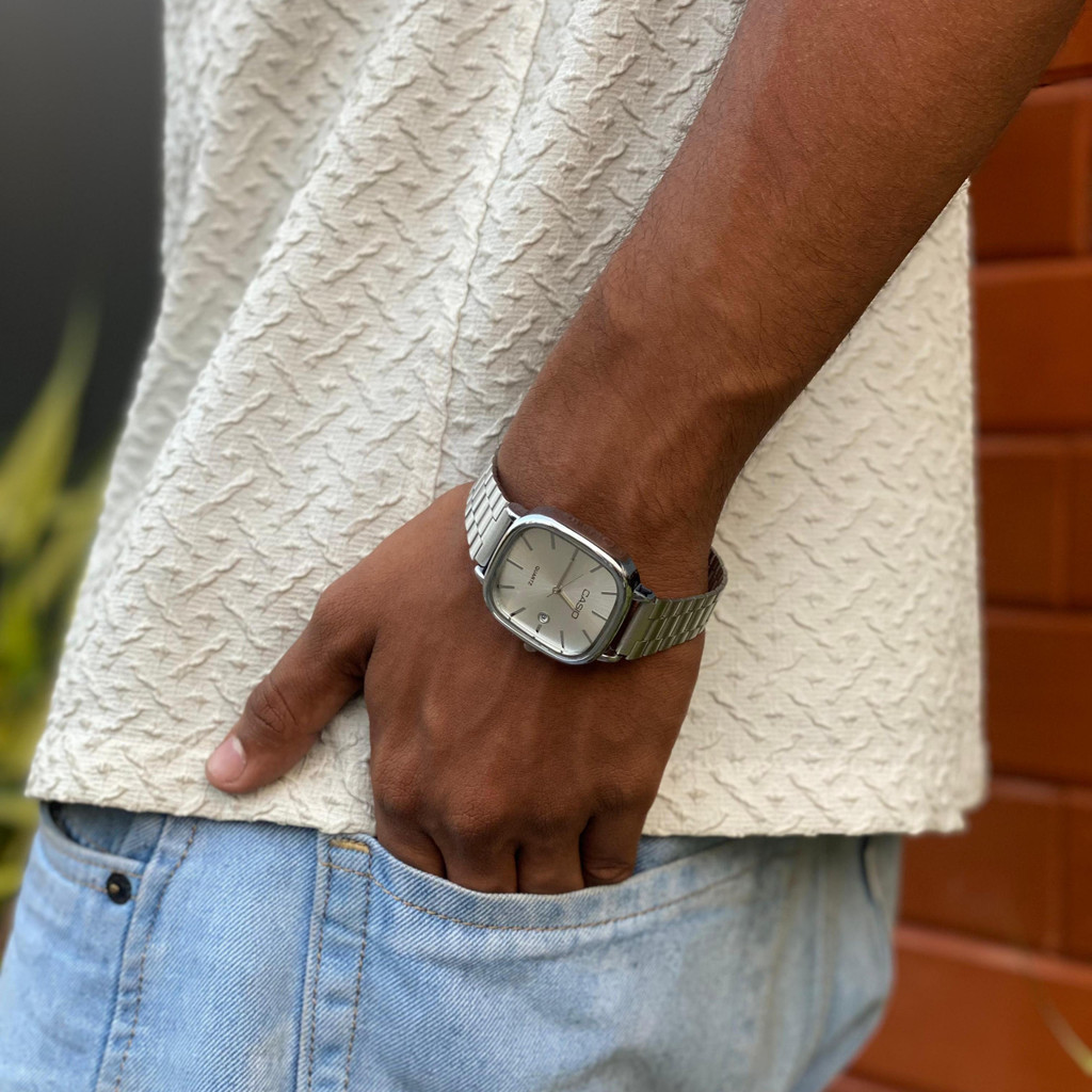 True to description: true Color: silver color Material: stainless steel rust steel Nice watch exactly as described. Good price. Good use quality is also excellent.