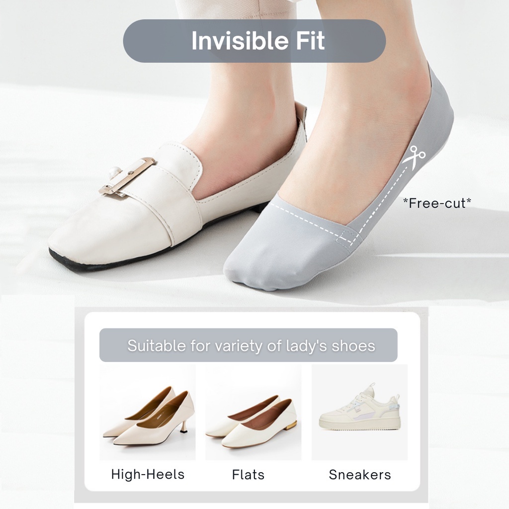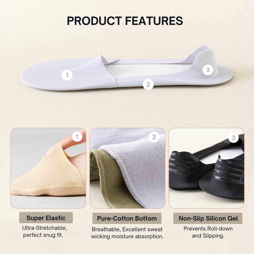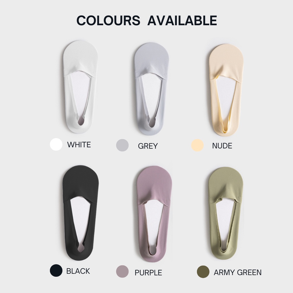 Colour:as advertised Material Quality:good - polyester top and cotton the sole Items arrived well packed and in good condition. The invisible socks are quite comfortable. The sole is 100% cotton with silicone dots to avoid slipping and the silicon edge on the heel helps to keep it in place and not to be slipping under the foot when walking. My foot size is 23 cm and the product fits nicely without being loose nor too tight. The product is very good!