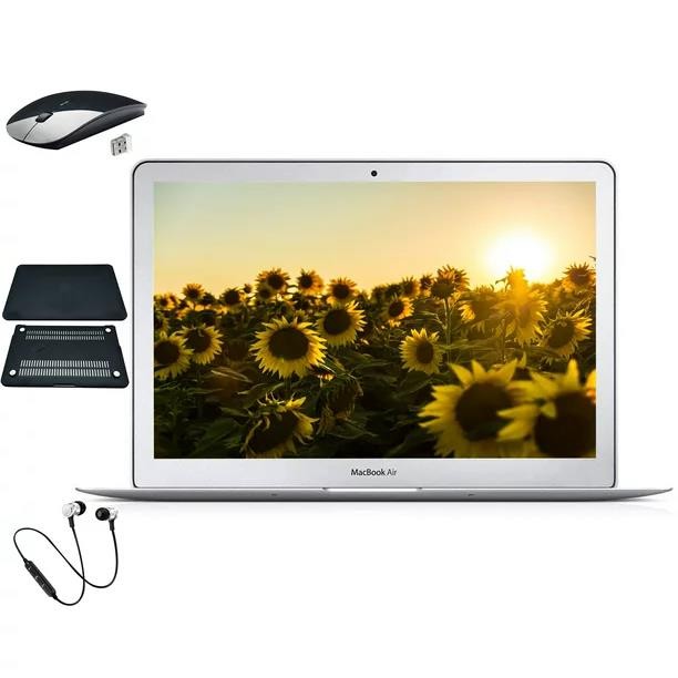 This Apple MacBook Air comes in Silver. It has an 11.6-inch widescreen TFT LED backlit active-matrix "glossy" display with 1366 x 768 native resolution. Powered by Intel Core i5 and Intel HD Graphics 5000. Solid State Drive (SSD) capacity of 128GB with 4GB of RAM. Bundle includes Black Case, Wireless Mouse, and Headset! This device has been tested to be in great working condition. It will show signs of use and cosmetic blemishes which may included some scratched/dings, all of which do not affect the usability of this device.