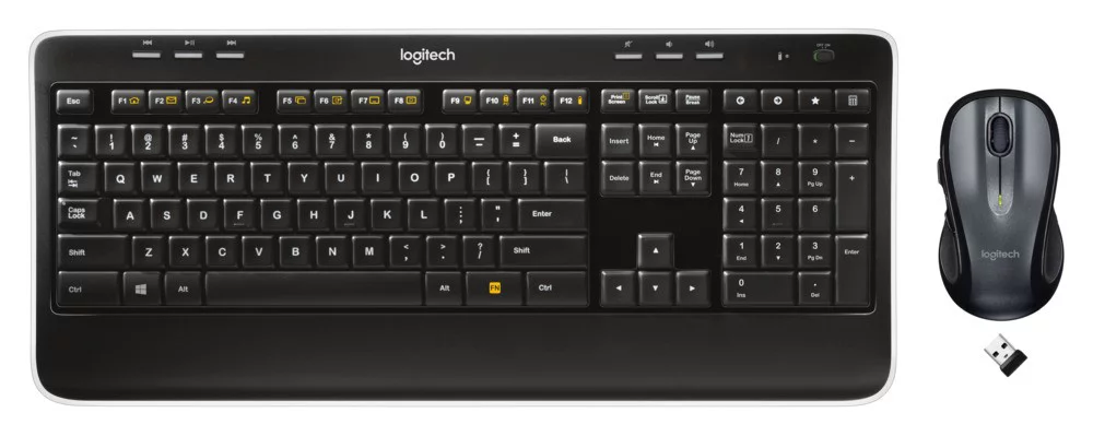 The Logitech Complete Wireless Combo puts convenience and control comfortably at your fingertips thanks to its full-size keyboard with concave keys and hand-friendly, contoured mouse. The keyboard’s full-size layout gives you the room you need to type comfortably with all the keys where you expect them to be. The concave design and softly rounded edges of the whisper-quiet, low-profile Logitech Incurve keys position your fingers properly and invite your fingertips to glide from key to key, hour after hour. The palm rest gives your hands the perfect place to rest when you’re not typing. And you can store your keyboard standing up to free up space on your desk when you’re not using it.