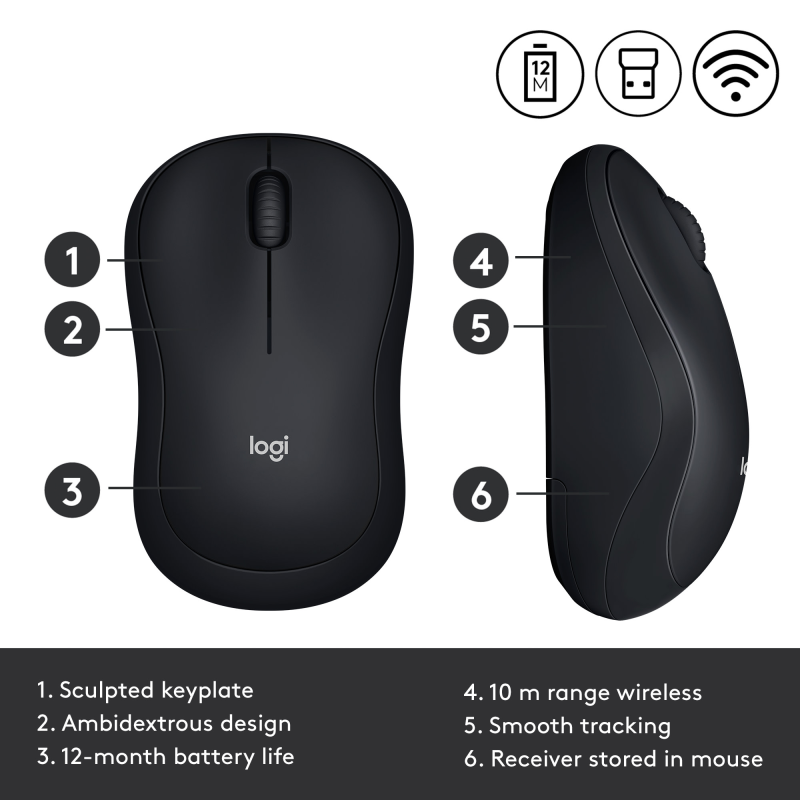 M185 wireless mouse (Black) is comfortable, compact, and easy to use, enables you to work anywhere. Simply plug the receiver into a USB port on your device to start working in seconds. The small size and smooth cursor control make it great for tight workspaces and busy desks. Stay productive longer with the comfortable, contoured shape that follows the natural curve of your hand. Compact and wireless, the mouse fits easily with your laptop in a bag so you can take it anywhere you work. M185 is designed to be equally comfortable for both left- and right-handed users.