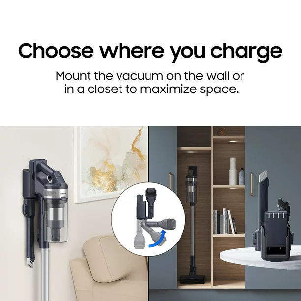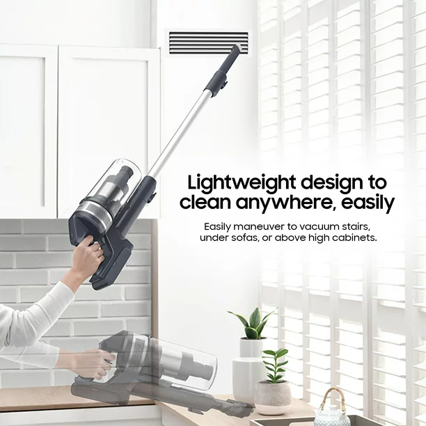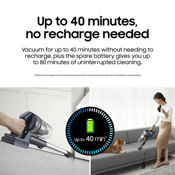 The SAMSUNG Jet 60 Fit Cordless Stick Vacuum features are our most lightweight and maneuverable Jet Stick vacuum coming in at less than 5 lbs. Our powerful Digital Inverter motor, coupled with our Jet Cyclone technology, delivers a consistent 150 Air Watts (est. 55,000Pa) of suction power for excellent cleaning performance on both carpets and hard floors. The Samsung Jet 60 Fit comes with a 21.6V removable battery that lets you vacuum for approximately 40 minutes on a low setting, and can be easily swapped for a spare (sold separately) to extend your cleaning. The Jet 60 Fit is compatible with the Samsung Clean Station for a convenient, hygienic way to empty the dustbin. The second battery is sold separately.
